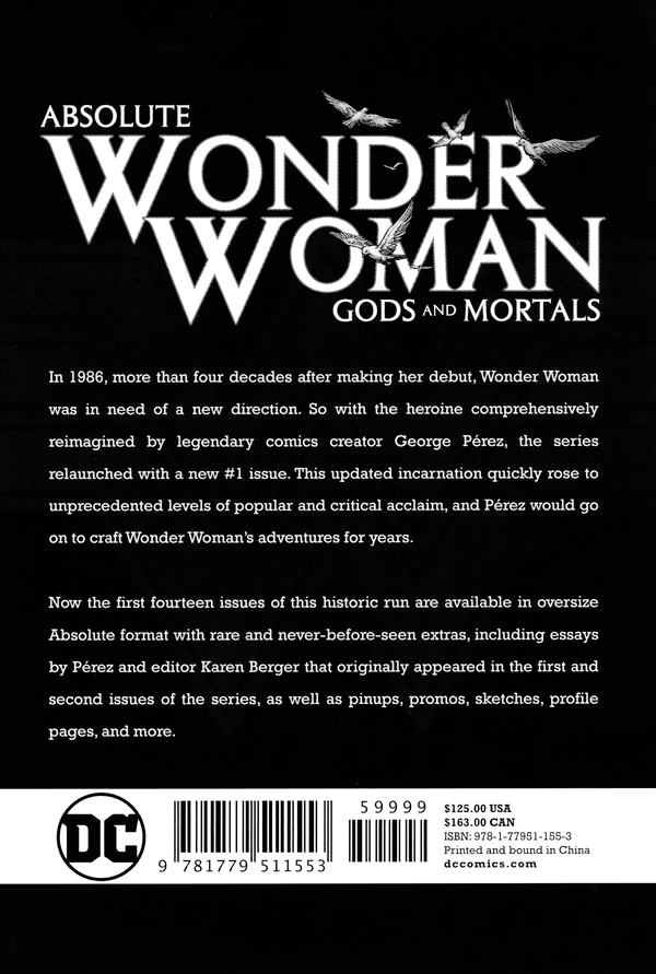A hardcover collection in the DC Comics "Absolute" series, the book showcases the first 14 issues of George Pérez's Wonder Woman run in a prestige format printed at a larger size than previously published. The book is housed in its own box cover and contains a number of supplements including essays and artwork.